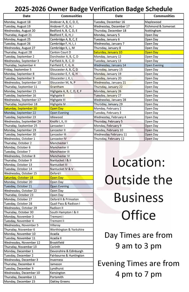 Our goal is to make this process as smooth and convenient as possible for everyone. Please review the important details below and refer to the association schedule to find out when and where to update your owner’s badge.