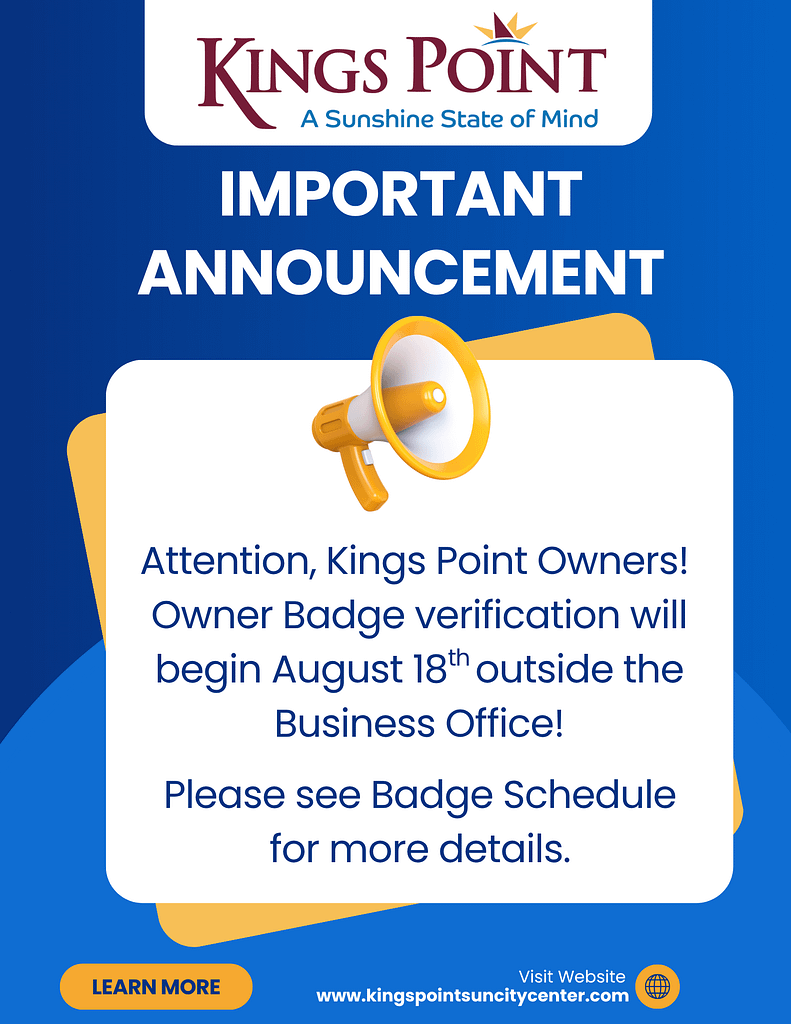 As some of you may recall, Kings Point amenities badges are periodically updated to help ensure proper utilization of the amenities.
