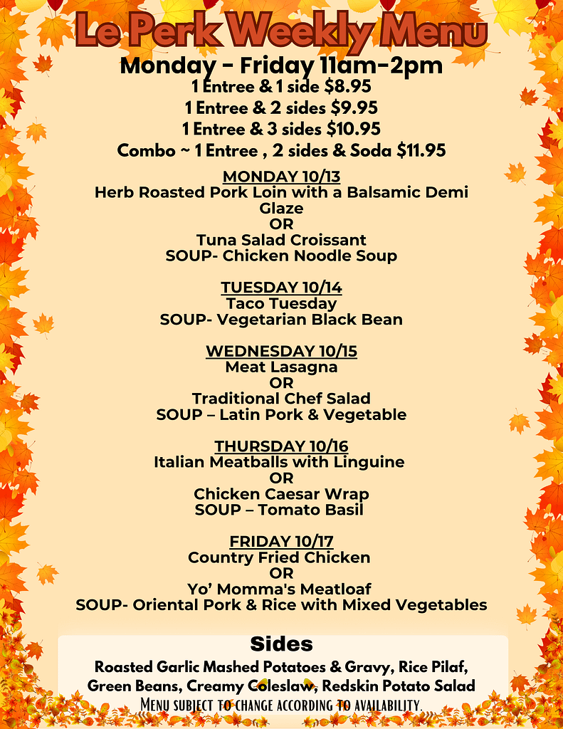 10/13 MONDAY – Warm Roast Beef Sandwich on Brioche Bun with choice of side $10.00