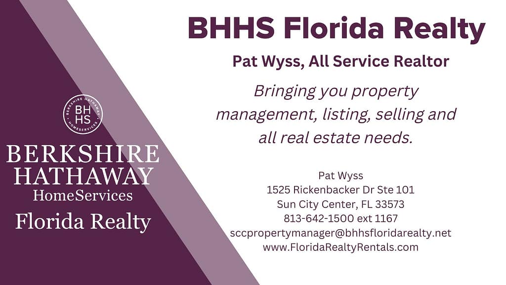 Berkshire Hathaway HomeServices Sun City Center, FL 33573 (Office) 813.642.1500 ext 1167 www.FloridaRealtyRentals.com |
